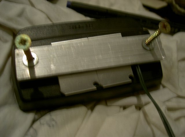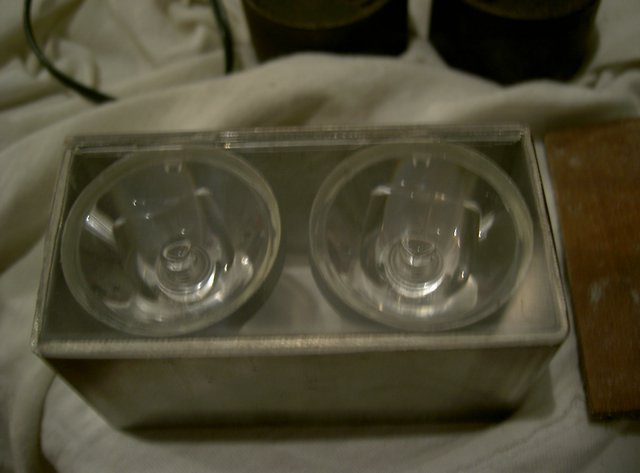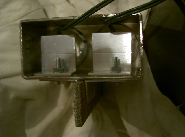 Da mich Ullis Warnungen bzgl. Verunreinigungen (auch Kleb) etwas verunsichert haben, wollte ich möglichst auf Kleb verzichten. Das Gehäuse ist ein Stück Stahlvierkant 40x80x2 (148g, weil mein Handwerker kein ALu hat). Man muss beim Bohren darauf achten, dass man scharfe Bohrer verwendet und die Bohrstelle gut mit Öl versorgt. Damit vorne nichts rausfällt ist ein Stück CD-Hülle aufgeklebt. Die Optik ist ein Narow-Beam "MOBDAR", sehr schmal mit einer Lage Gewebeklebeband zum leichteren Einklemmen umwickelt. Dann werden die LEDs auf die Mobdar aufgelegt und die Halte- und Kühlwinkel mit Sekundenkleber zur Fixierung an die LED angeklebt. Zur besseren Haltbarkeit werden die LEDs noch mit Uhu Endfest am Rand mit dem Winkel verklebt. Damit haben die LEDs keine feste Verbindung zur Optik und werden "nur" durch die Verschraubung der Winkel in Position gehalten. Den Abschluss bildet ein eingeklemmtes Stück Isomatte, sowie ein Deckel als Blendschutz.