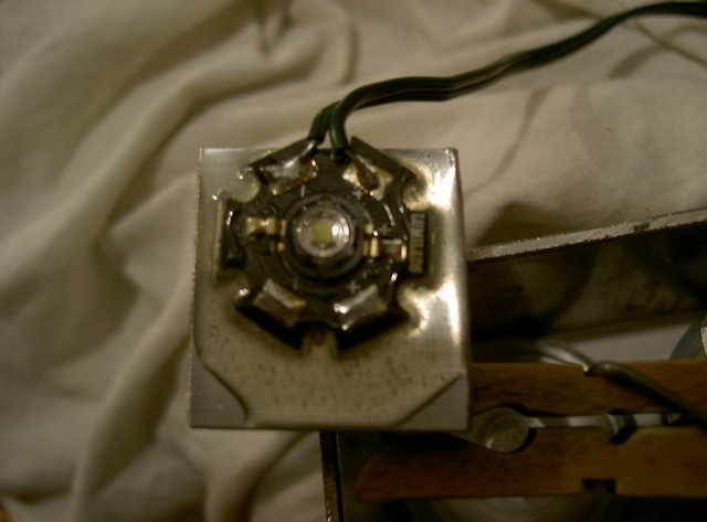 Einfach mit einem Dremel entsprechende Löcher in die Rückwand bohren und die fertigen LXHL-NH94 einschieben. Zur Kühlung wird noch ein 2mm Alu-Blech mitverschraubt. Da die Reflektorpyramiden das Licht zu stark gestreut haben, habe ich mit dem Dremel auf einer Kreisfläche (D<1cm) die Pyramiden in Pyramidenstümpfe verwandelt. Ich hab "unter Wasser" geschmirgelt, um eine glattere Oberfläche zu erhalten.