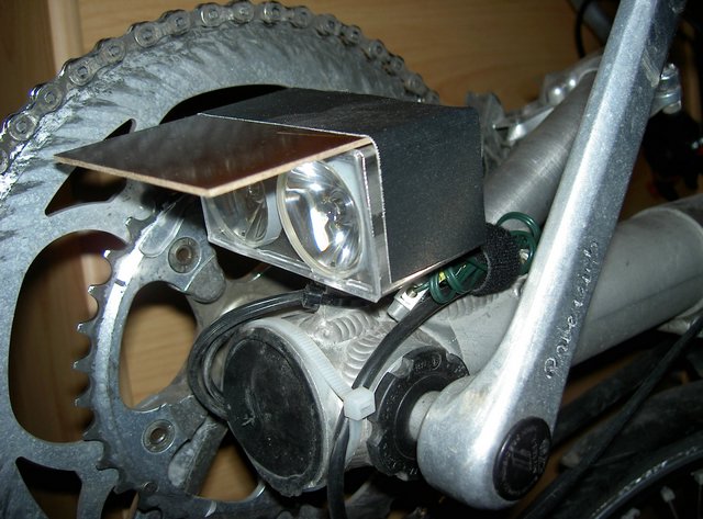 Der SON Nabendynamo liefert seinen Strom an einen Gleichrichter. Von da aus werden in Serie die zwei Frontscheinwerfer und das Rücklicht versorgt.